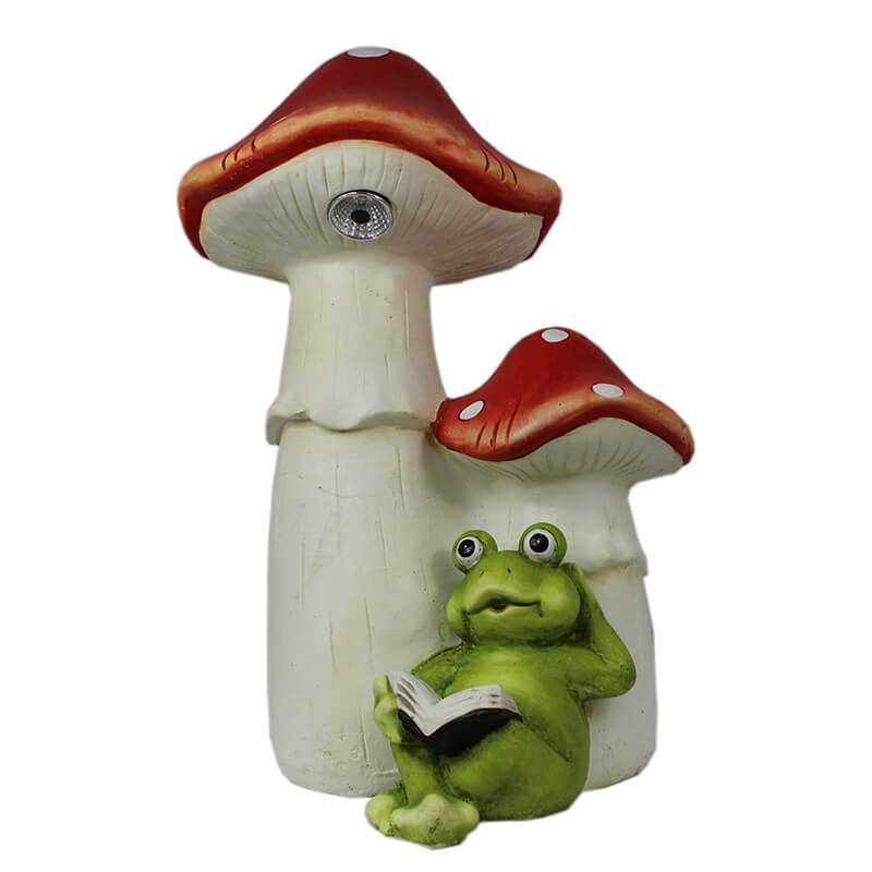 Lampka solarna przedstawiająca czytającą żabę pod dwoma grzybami, które ją oświetlają diodą led. Wykonana z ceramiki, dzięki czemu nie żółknie od słońca. Jest to ciekawa i przykuwająca wzrok dekoracja pasująca do każdego ogrodu.